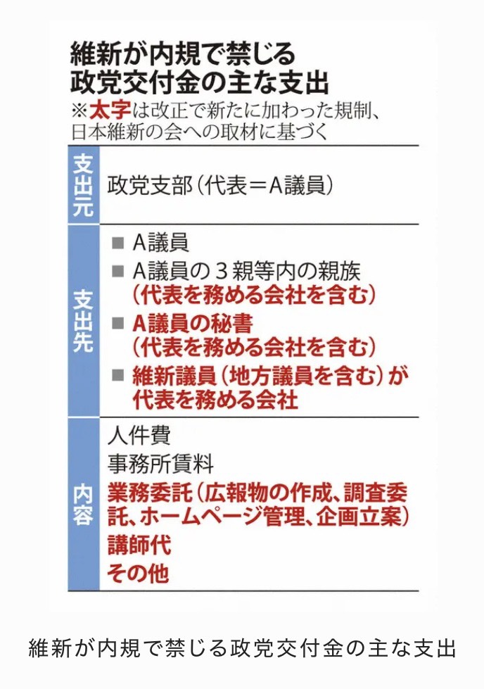 維新は「身内」への公金支出が相次ぎ指摘されたことを受けて、政党交付金に関する内規を改正した。従来、議員や3親等内の親族への人件費や事務所賃料の支出を禁じてきたが、来年1月以降は支出先や対象となる業務を拡大。秘書や秘書が代表を務める会社のほか、地方議員が代表の会社にも適用する。
