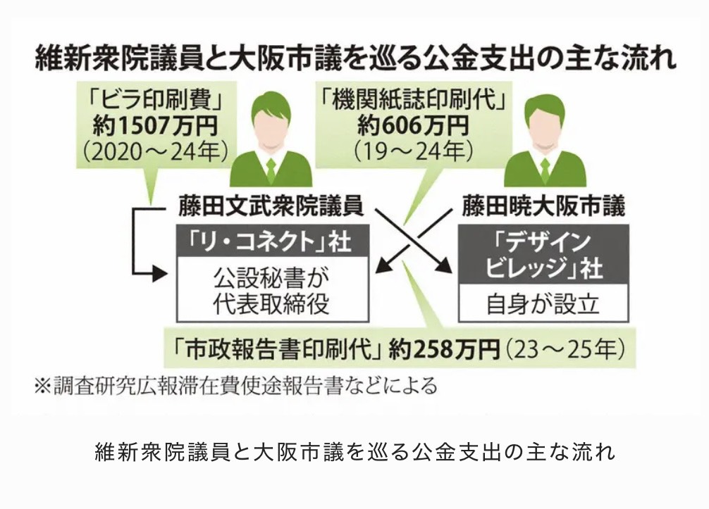 今回新たに、藤田暁大阪市議が設立し、一時は自宅を所在地にしていた広告会社「デザインビレッジ」(大阪市北区)に広報物を発注していたことが判明。19~24年の少なくとも約606万円について、政党交付金や調査研究広報滞在費(旧文書通信交通滞在費)などの公金を充てていた。